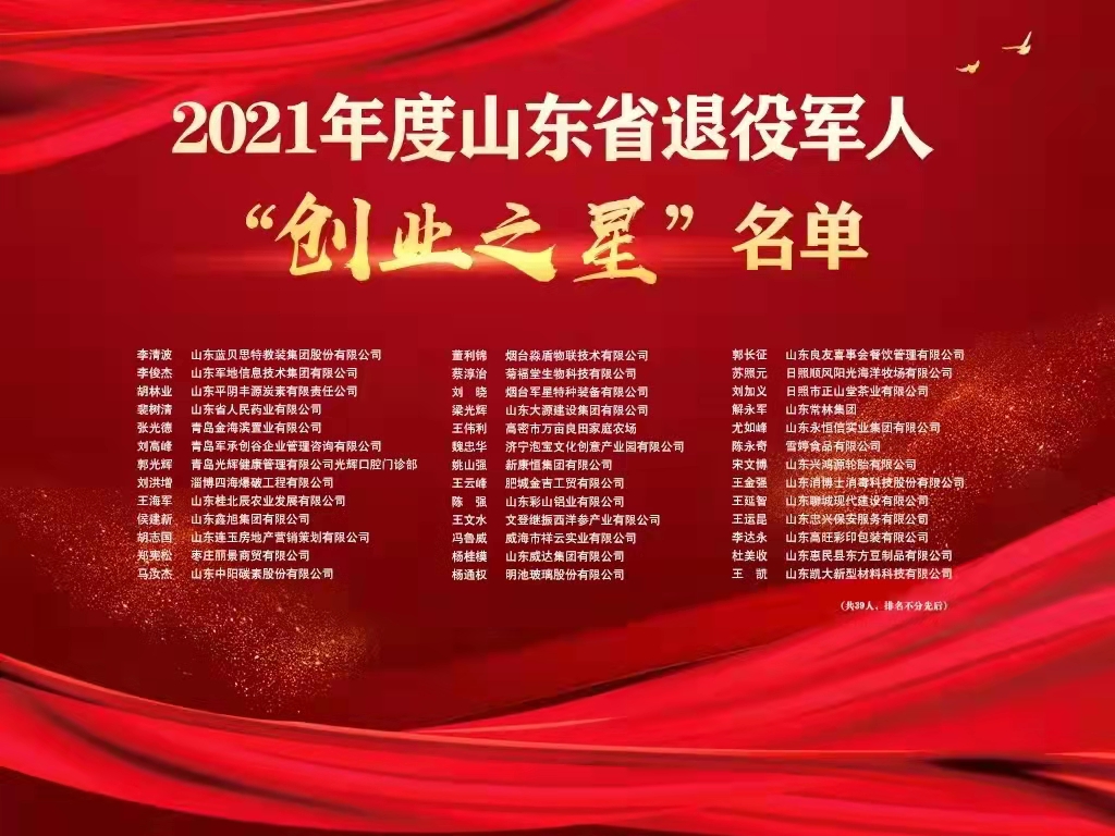 山東省人民藥業(yè)有限公司董事長裴樹清在此次活動中榮獲“創(chuàng)業(yè)之星”。服役時是優(yōu)秀軍人,退役后是創(chuàng)業(yè)之星。裴樹清從一名退役軍人成為一名優(yōu)秀企業(yè)家。退役不褪色,創(chuàng)業(yè)就能成,部隊培養(yǎng)了退役軍人吃苦耐勞、堅韌不拔的優(yōu)良作風(fēng),是他今天獲得成功的秘笈。作為退役軍人,不管在哪里、以什么身份,為國奉獻是一種本能。在董事長裴樹清的帶領(lǐng)下,山東省人民藥業(yè)有限公司經(jīng)過十多年的發(fā)展壯大,2021年10月被全國工商聯(lián)醫(yī)藥業(yè)商會評選為“2020年度全國醫(yī)藥商業(yè)百強企業(yè)”。企業(yè)綜合實力和聲譽在醫(yī)藥行業(yè)中進一步提高。作為退役軍人,裴樹清始終保持著厚重的軍旅情懷。公司先后接收70多名退役軍人和軍嫂就業(yè),有些退役軍人因多種原因生活較為困難,裴樹清總是想方設(shè)法安置好他們的工作,盡可能在經(jīng)濟上給予照顧,幫助他們解決生活中遇到的實際困難。每年“八一”建軍節(jié)都要給在公司工作的退役軍人和軍嫂們放假一天,還為他們發(fā)放八一節(jié)禮品,再請他們吃頓飯。使他們充分感受到社會的溫暖,使他們在企業(yè)內(nèi)得到了應(yīng)有的尊重。企業(yè)在招聘時總是優(yōu)先考慮參戰(zhàn)英雄、退役軍人和軍嫂。