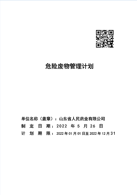 山東省人民藥業(yè)有限公司危險廢物污染環(huán)境防治信息公示 我公司2021年度處置危險廢物14.32噸,2022年危險廢物管理計劃公示如下: