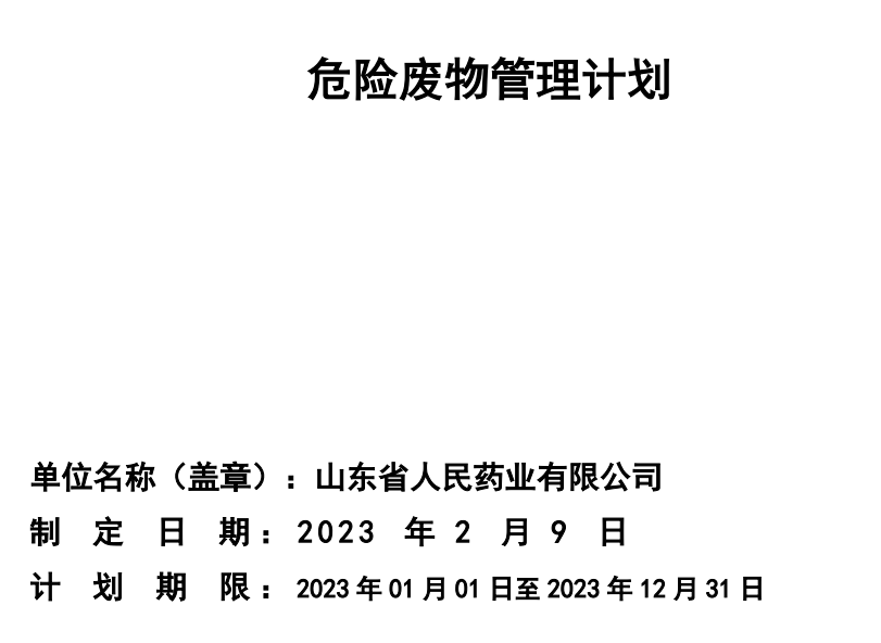 山東省人民藥業(yè)有限公司危險廢物污染環(huán)境防治信息公示 我公司2022年度處置危險廢物6.03噸,2023年危險廢物管理計劃公示如下: